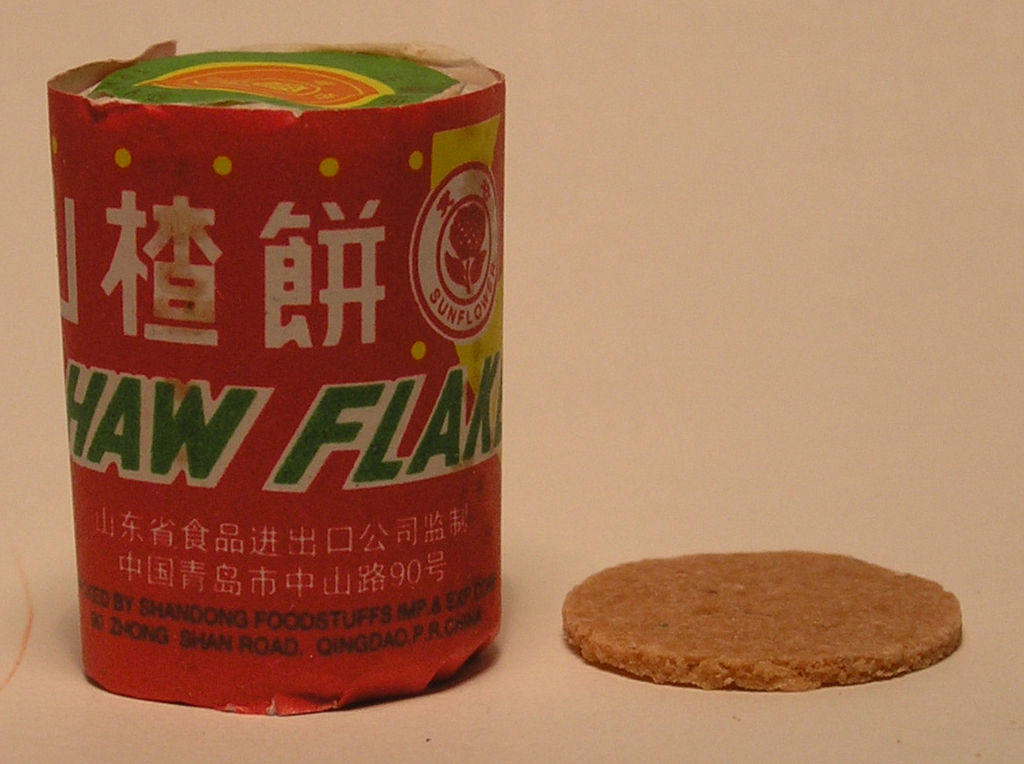 Haw Flakes are Chinese sweets made from the fruit of the Chinese hawthorn. The dark pink/ purple candy is usually formed into discs two millimeters thick, and packaged in cylindrical stacks with label art resemblant of Chinese fireworks. Some Chinese people take the flakes with bitter Chinese herbal medicine.