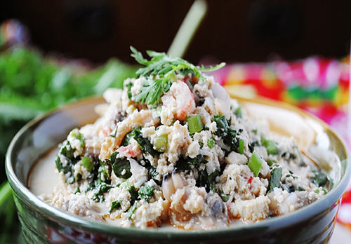Okara is eaten in the Shandong cuisine of eastern China by steaming a wet mixture of okara that has been formed into blocks of zha doufu (also known as xiao doufu or cai doufu).